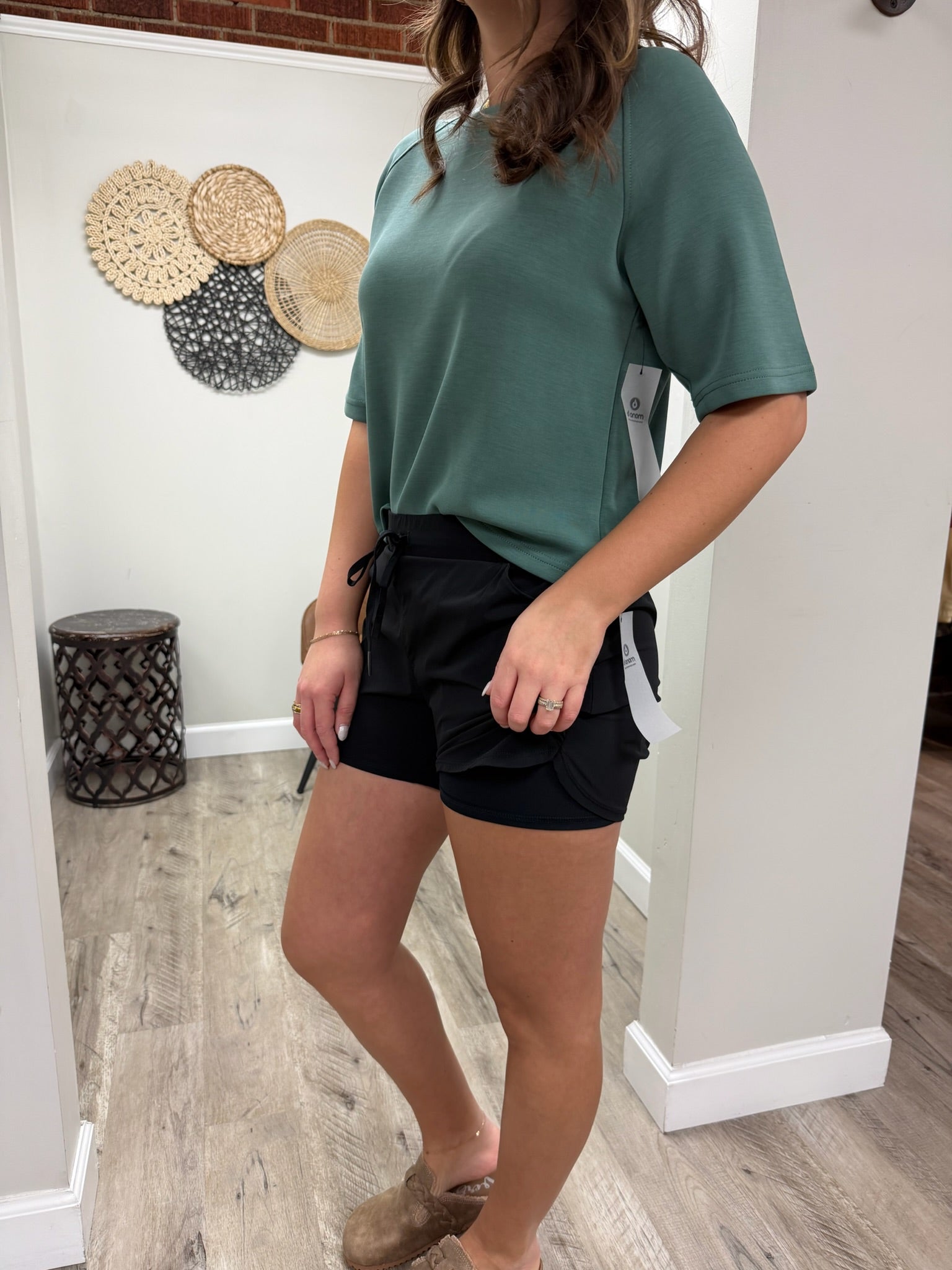 These shorts have a drawstring waist, side pockets, and a curved hemline giving you more mobility and flexibility. They have a secret zipper pocket on the right leg and built-in shorts offering you additional security.