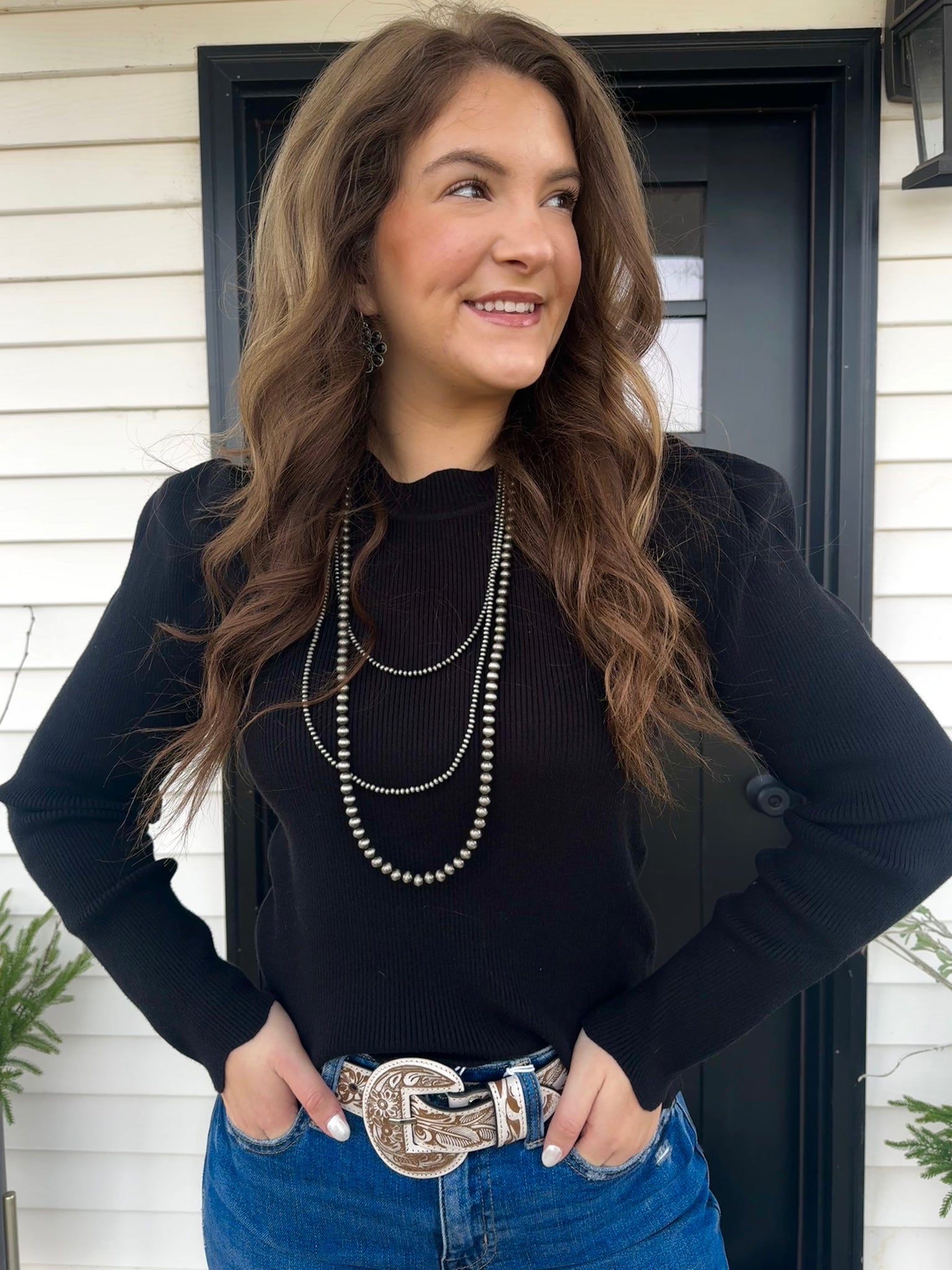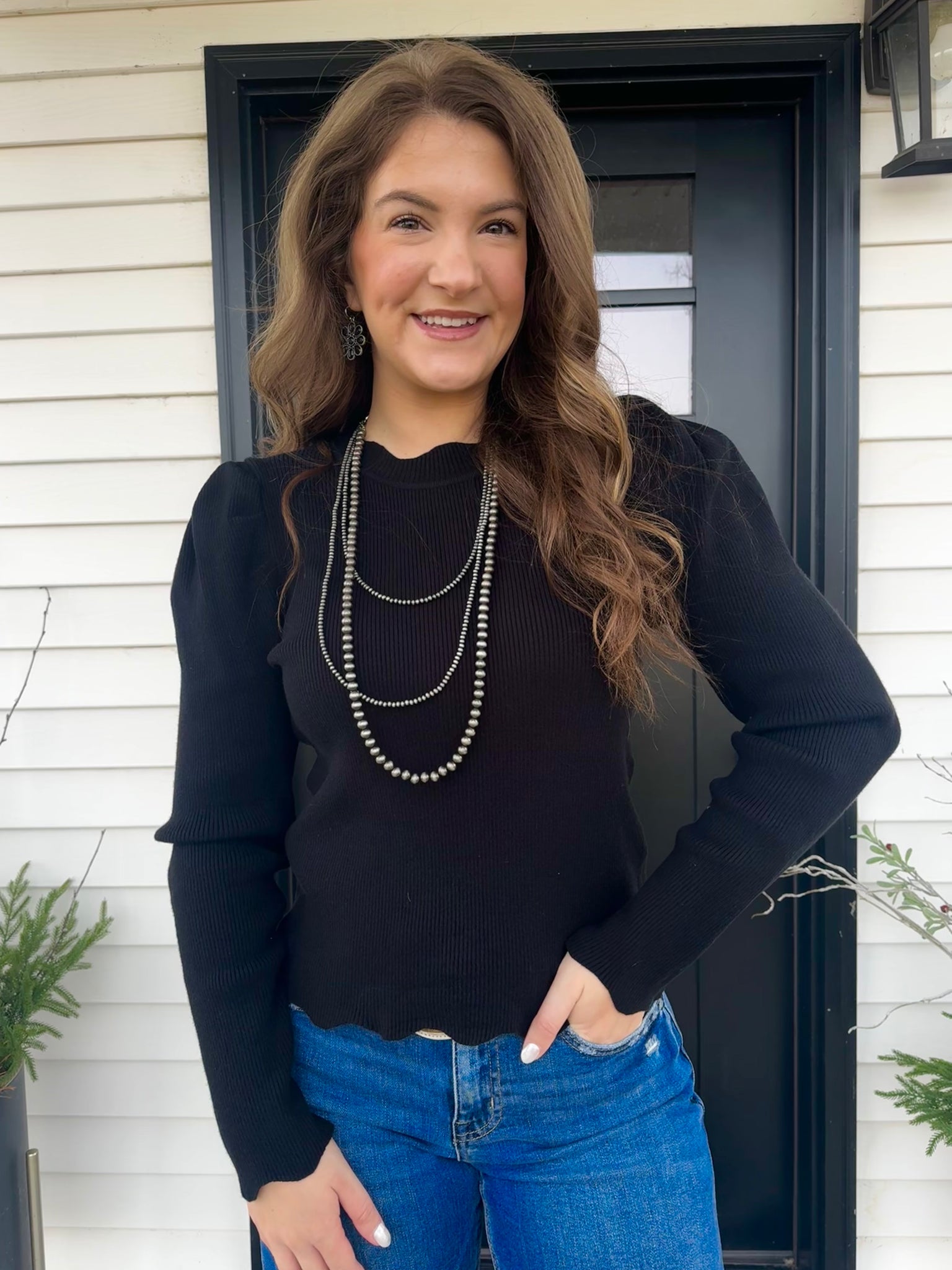 Puff shoulder long sleeves rib knit top with scallop edge detail, pintucked shoulder.