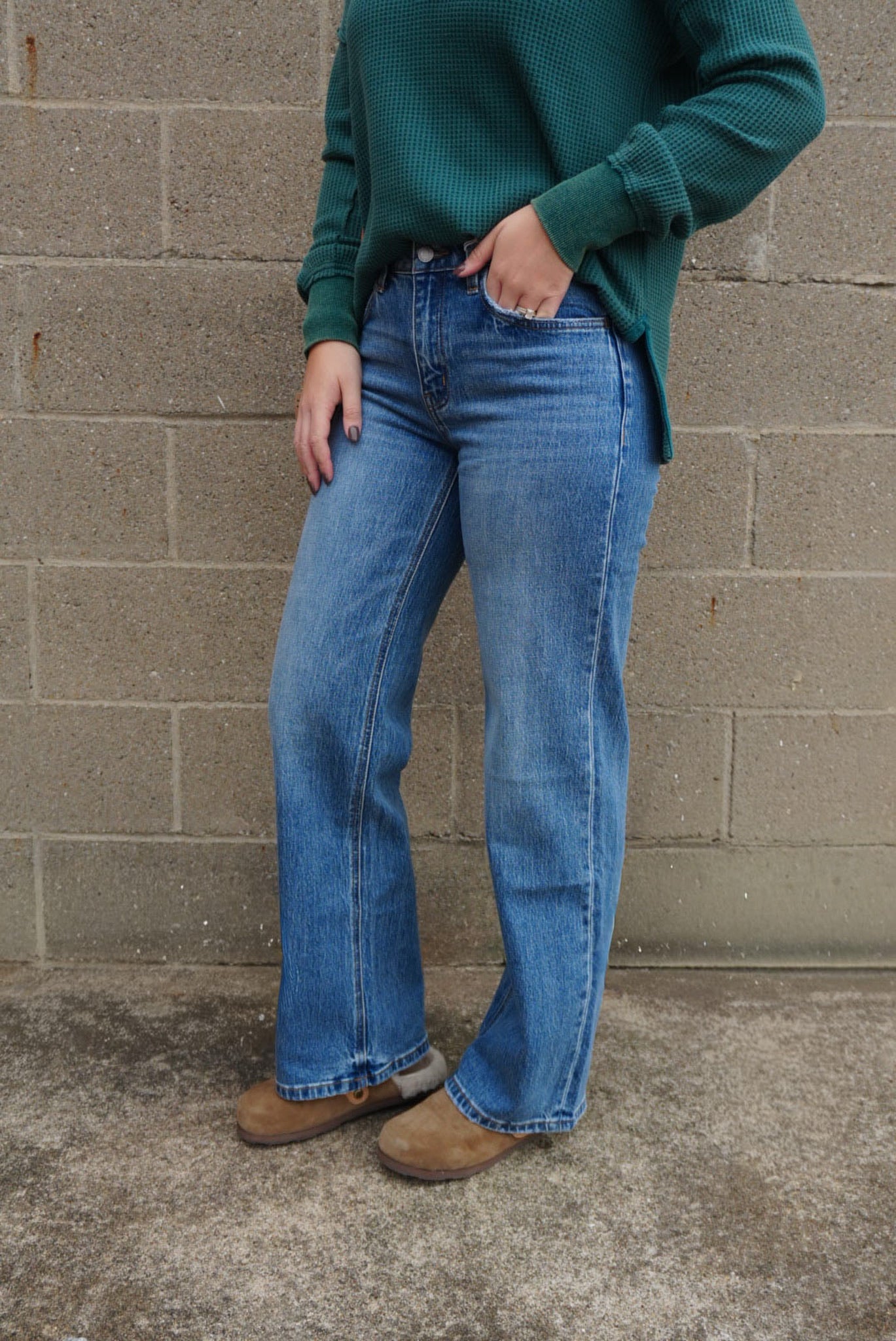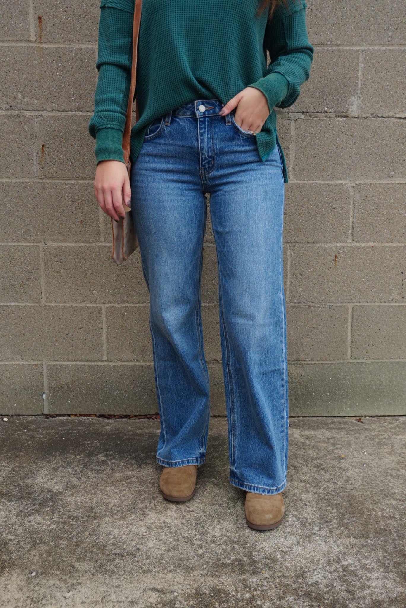 COMFORT STRETCH DENIM, HIGH RISE WAIST, 5 POCKETS, FINISHED HEM, FULL LENGTH, MEDIUM WASH, WIDE LEG JEANS