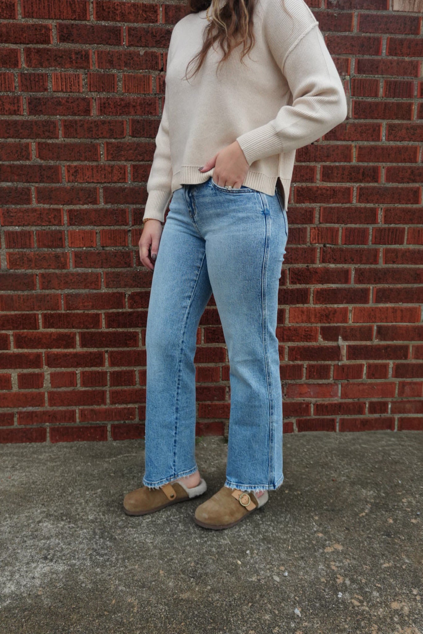 COMFORT STRETCH DENIM, MID RISE WAIST, 5 POCKETS, FINISHED HEM, FULL LENGTH, MEDIUM WASH, SLIM WIDE JEANS