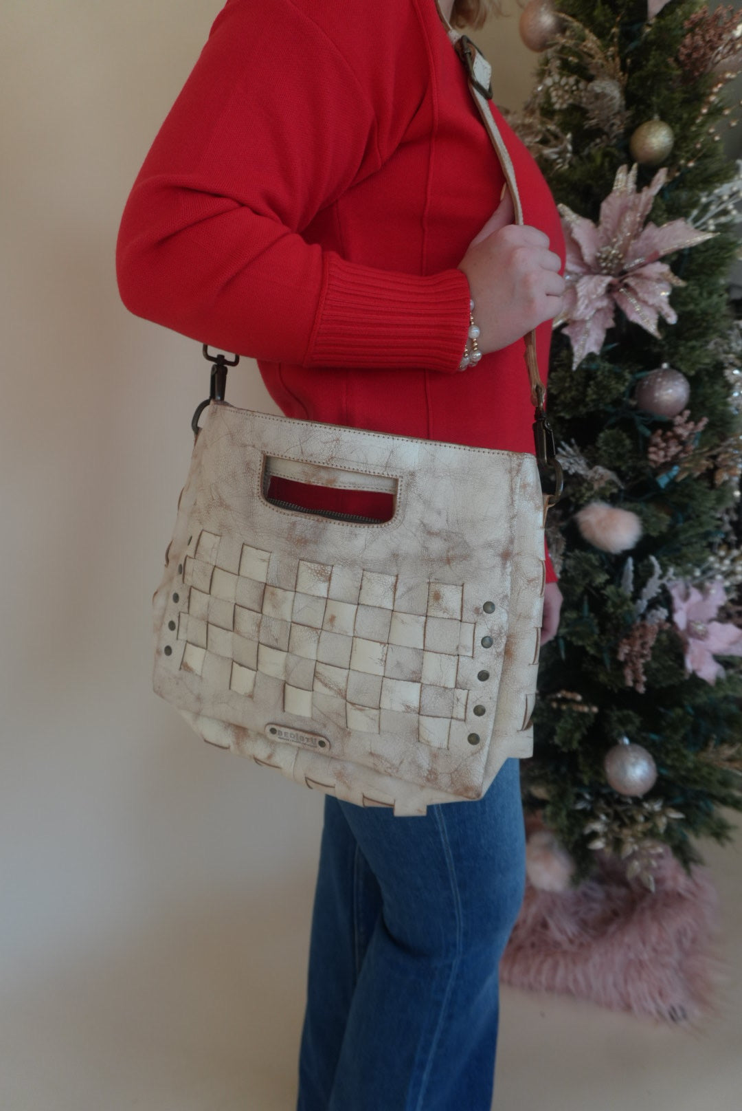 - Woven leather panels with flat stud details